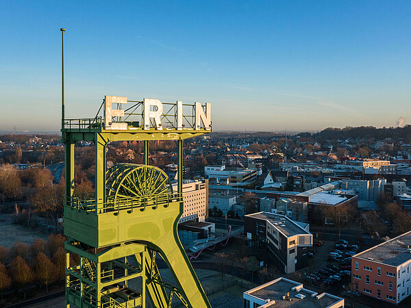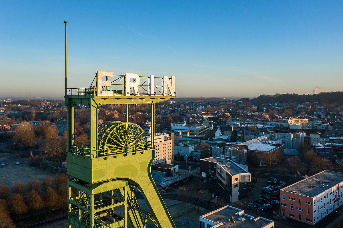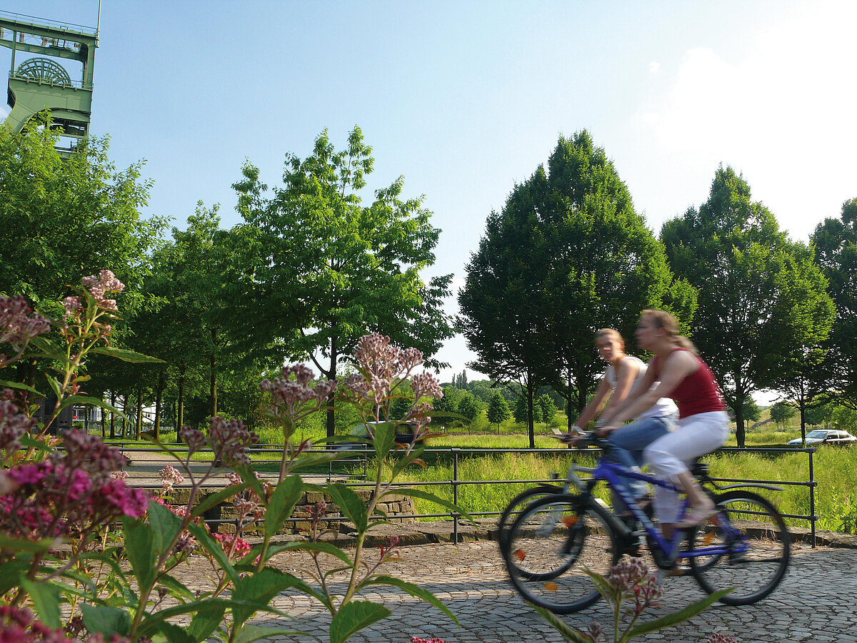 Los geht es bei dem Rundkurs vom Startpunkt am Hauptbahnhof Castrop-Rauxel in südlicher Richtung zur damaligen Zeche Erin. Nach Ende der Kohleförderung und Zechenstilllegung im Jahr 1983 entstand auf dem gut 42 ha großen Zechengelände in direkter Nachbarschaft zur Castroper Innenstadt ein modernes Gewerbegebiet mit schönen, großzügigen Parkanlagen. Nächstes Ziel ist der imposante, mittlerweile älteste Hammerkopfturm Westfalens über dem Wetterschacht 3 von 1929. In Anlehnung an die irischen Ursprünge der Zeche Erin (latinisierte Form des gälischen Namens für Irland) wurde hier ein keltischer Baumkreis angelegt. Vorbei an dem pittoresken Bergbeamtenhaus geht es weiter nach Süden zur Bergehalde Schwerin, die auf dem Hochplateau mit Sonnenuhr tolle Ausblicke in die Umgebung bietet. Vorbei am Deininghauser Bach geht’s zwischen Wäldern, Feldern und Wiesen nordwärts in das Naturschutzgebiet Beerenbruch, weiter am Brunosee vorbei bis zur Emscher und dann zum Industrie- gebiet Zeche Ickern, wo man bis 1973 Kohle förderte. Ein noch erhaltenes Kauengebäude beherbergt heute das AGORA Kulturzentrum, von dem es nun über die Emscher durch den Gewerbepark Victor zurück zum Bahnhof geht.