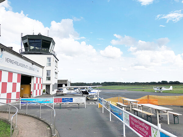 Zwischen Pferdekoppeln hindurch kommt man nun wieder zurück zum Ausgangspunkt der Radroute am Flugplatz Loemühle, wo der Tag im dortigen Biergarten, der direkt am Vorfeld liegt, seinen gelungenen Ausklang findet. Hier besteht nämlich nicht nur die Möglichkeit, den Flugzeugen bei Start und Landung zuzusehen, sondern ein toller Ausblick ins Grüne und der direkt neben dem Biergarten liegende, für die Kleinen rundum eingezäunte Spielplatz bieten dazu den perfekten Ort, die Seele baumeln zu lassen und auch mal richtig „runterzukommen.“