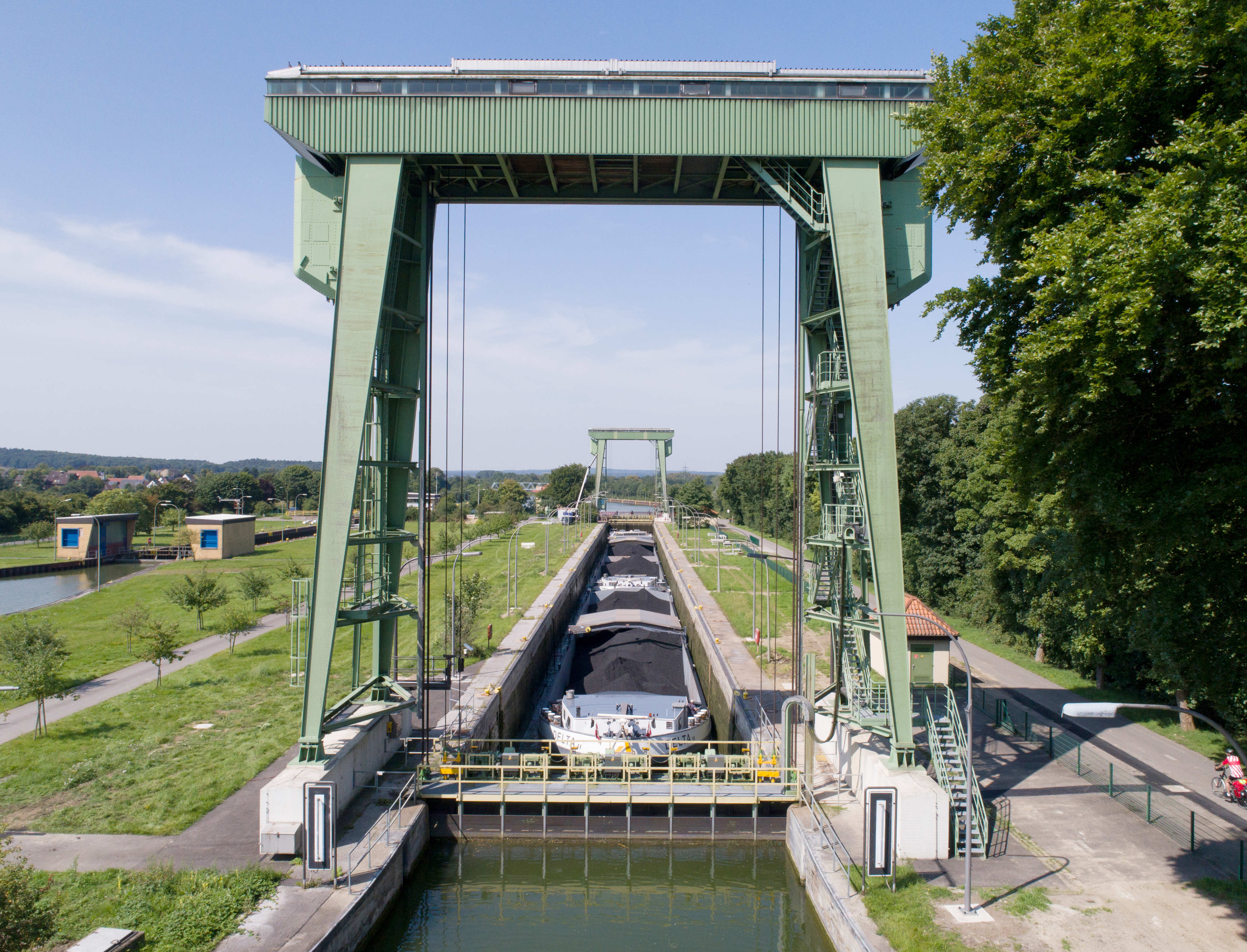 Nach Errichtung der großen Kammer (225 m lang, 11.500 m Stauvolumen) nahm die Schleuse Flaesheim im Jahre 1929 den Betrieb auf. Hinzu kam im Jahre 1969 die kleine Kammer (110 m lang, 6.600 m Stauvolumen). Mit diesen Anlagen werden 4 Meter Höhenunterschied ausgeglichen.