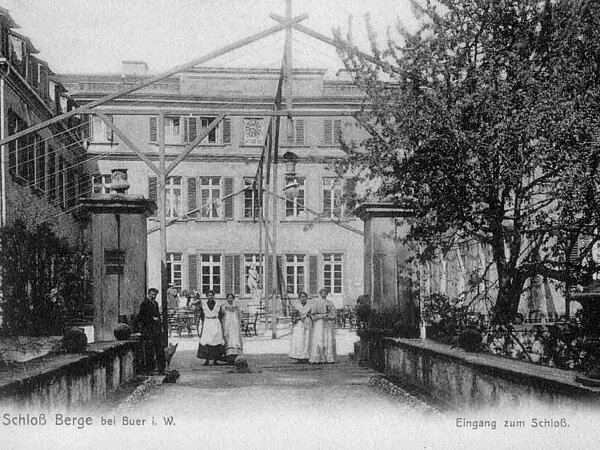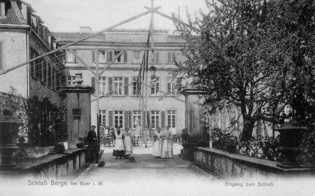 Standort auf Südseite des Buerschen Berges im Stadtteil Buer -- bis 1433 Stammsitz der Familie von Berge -- früher Wasserburg -- Ende 18. Jh. zum heutigen Schloss umgebaut -- Stil des Spätbarock und Frühklassizismus -- Parkanlagen kaufte Stadt 1923 dem Reichsgrafen Westerholt-Gysenberg -- seither frei zugänglich -- u.a. Rokoko-Garten
