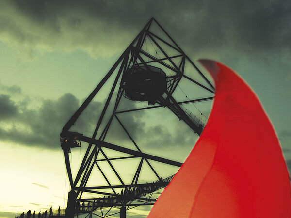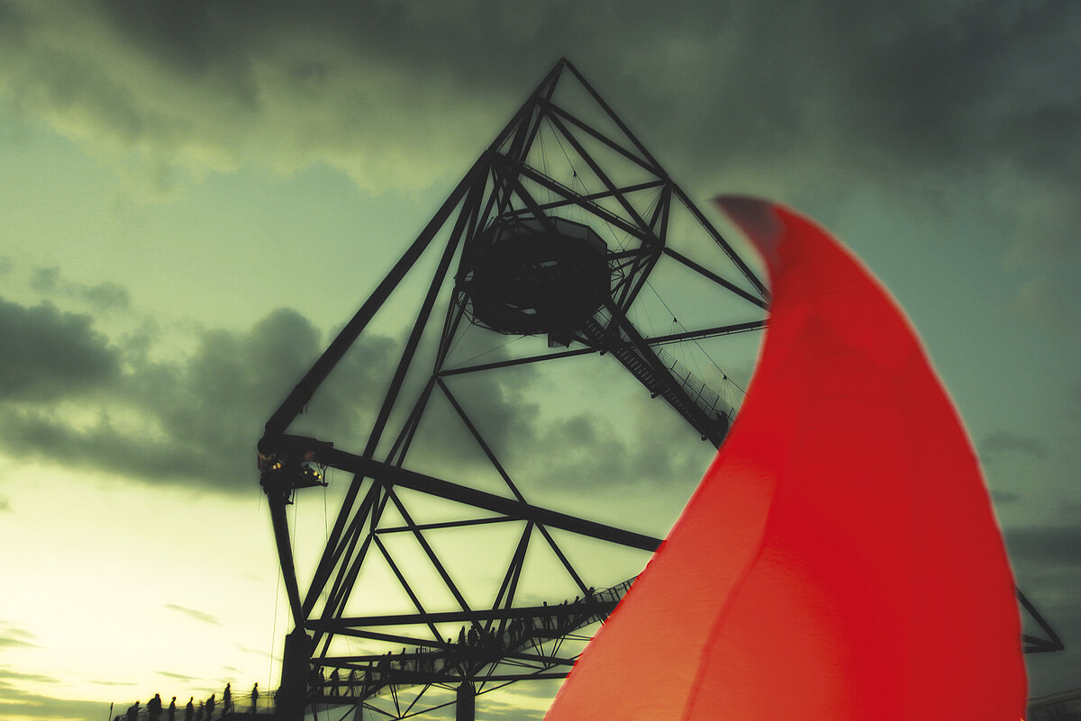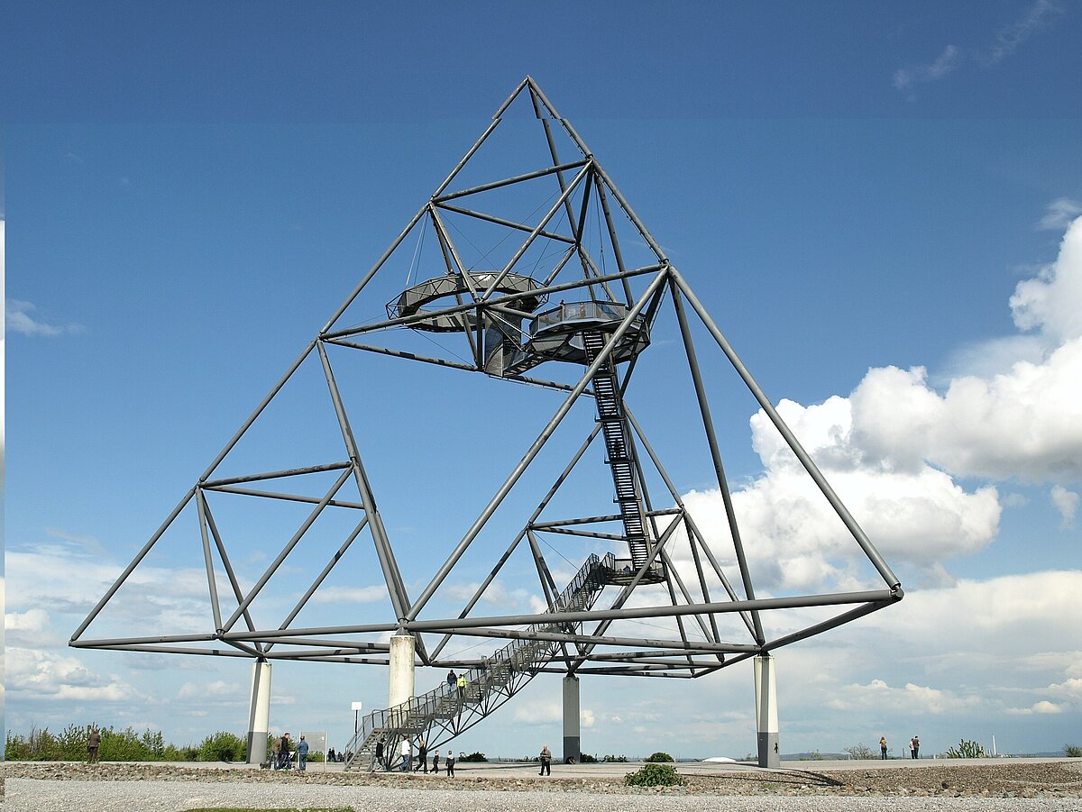 vorher von vielen nicht gewollt, heute eine Landmarke -- Produkt der IBA Emscherpark -- Kantenlängen 60 m, 38 m hoch, 10 Tonnen Stahl und 1,5 km Gesamtlänge der Rohre: das Tetraeder -- Konstruktion und Lichtinstallation "Haldenereignis Emscherblick" von Wolfgang Christ und Jürgen Fischer -- oberste Plattform auf 38 m über Haldentop