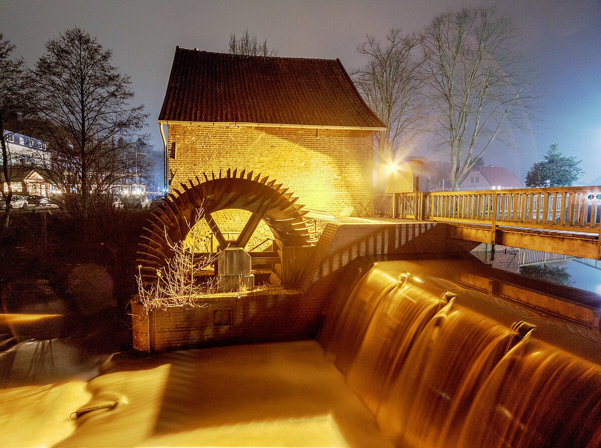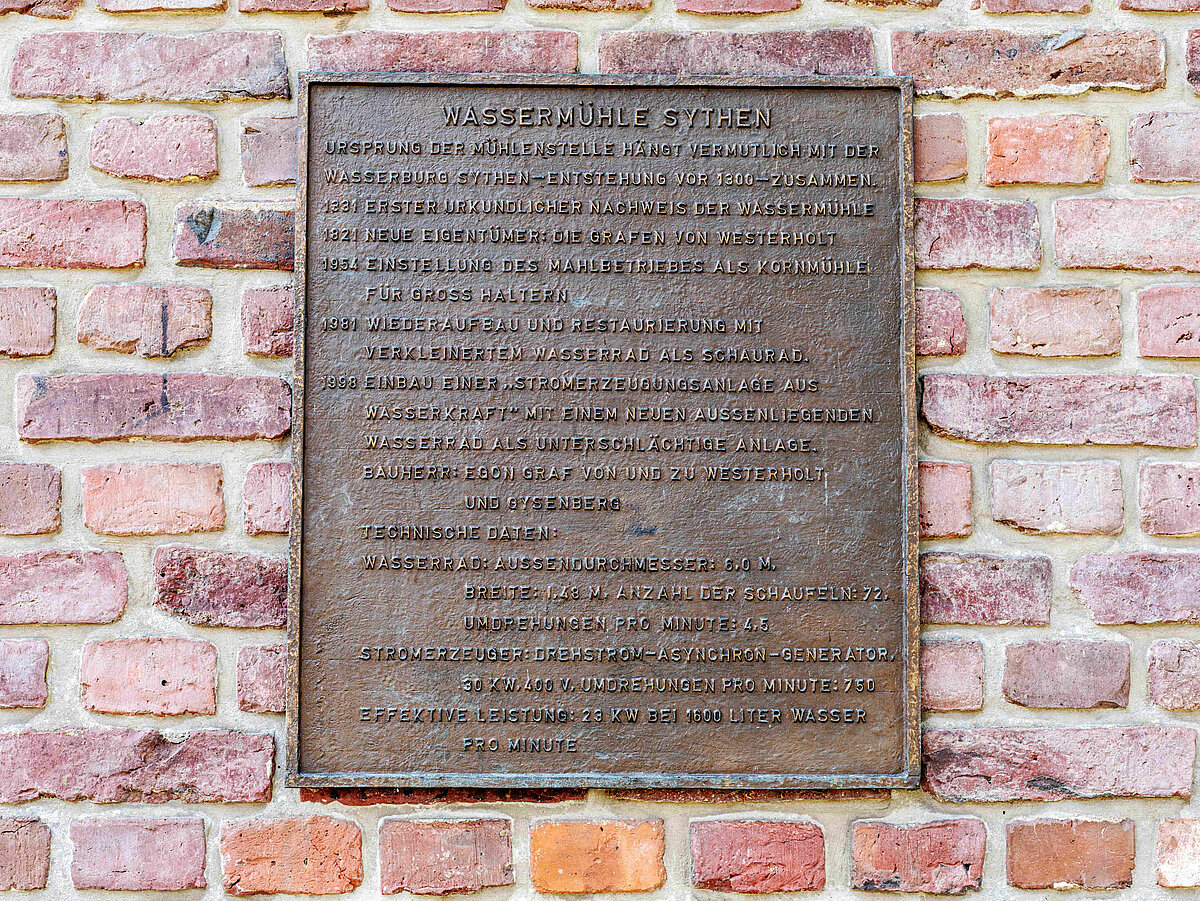 Die 1331 erstmals genannte Sythener Wassermühle gehörte zum nahe gelegenen Schloss Sythen und ist heute in Besitz der Grafen von Westerholt. Das Wasserrad wird von einem aufgestauten Arm des Halterner Mühlenbachs gespeist und treibt inzwischen ein kleines Wasserkraftwerk an. Bei 1600 Litern Wasser pro Stunde liefert es 23 kW, die in das öffentliche Stromnetz eingespeist werden. Die Korn- und Ölmühle wurde zu Beginn der 1980er Jahre restauriert und zu einer Begegnungsstätte ausgebaut. In dem urigen Fachwerkgebäude findet regelmäßig Musikveranstaltungen oder Vortragsabende statt.