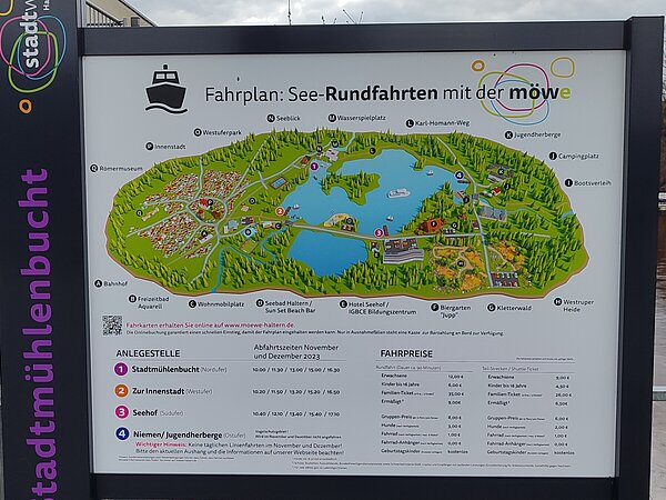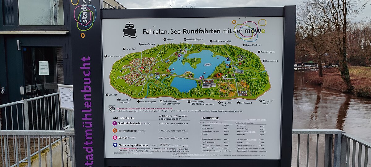 Seerundfahrten auf dem Halterner Stausee sind mit dem Fahrgastschiff Möwe von März bis Oktober möglich. In ca. 55 Minuten schippert ihr vorbei am Seebad und dem Restaurant Seeterrassen, der Vogelinsel, dem Hotel Seehof, dem Hohen Niemen und dem Segelboothafen/Stadtmühlenbucht und entdeckt vom Wasser aus die schöne Natur. Das Schiff fasst 182 Personen, bei größeren Gruppen bittet der Kapitän um Voranmeldung. Es gibt drei Anlegestellen: Stadtmühle/Nordufer, Seehof/Südufer, Haus Niemen/Ostufer.