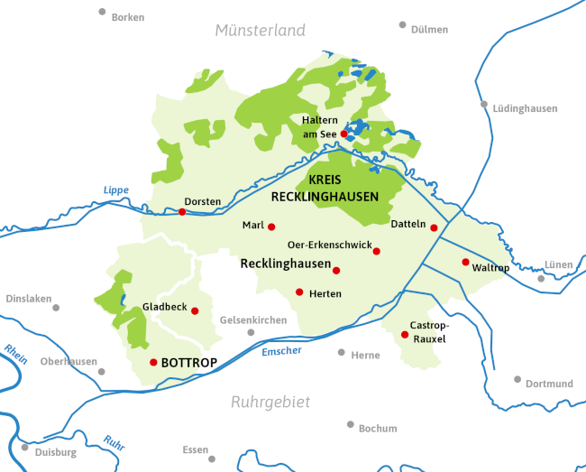 Eingebettet zwischen den Flüssen Lippe und Emscher, am Übergang zum Münsterland liegt die Freizeitregion Nördliches Ruhrgebiet. Wie kaum eine andere Region in Deutschland vereint die auch Vest (gesprochen: Fest) genannte Gegend beeindruckende Industriekultur mit reizvollen Naturlandschaften. Wer sich für Kultur, Natur, Wandern, Radfahren, Reiten oder Wassersport interessiert ist hier im Paradies. Zum nördlichen Ruhrgebiet gehören der Kreis Recklinghausen mit den zehn Städten Castrop-Rauxel, Datteln, Dorsten, Haltern am See, Herten, Gladbeck, Marl, Oer-Erkenschwick, Recklinghausen und Waltrop sowie die Stadt Bottrop.
