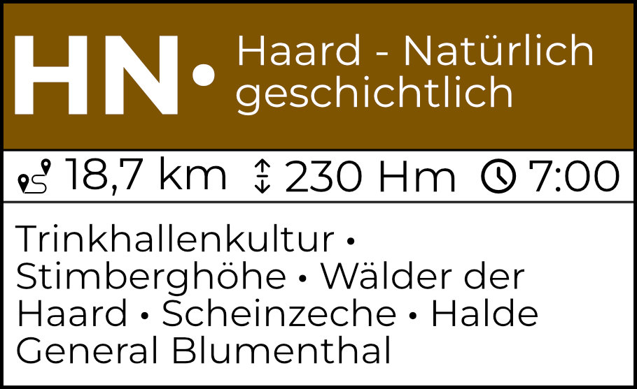 Die Thementour HN ist die nördlichste, die längste und durch ihre Mischung eine besondere. Sie startet an der Stimbergstraße in Oer-Erkenschwick zwischen den Stationen 1 und 16. Sie führt im ersten Abschnitt von der alten Zeche und Halde Ewald Fortsetzung kurz durch die Stadt, zu Trinkhalle und Freizeitstätte, um dann sofort und lange durch die Natur der Haard, das größte zusammenhängende Waldgebiet der Region, zu führen. Doch auch dort wird tatsächlich durch Bergbaugeschichte gewandert und an überraschenden Erzählstationen wie Stollen und Scheinzeche erzählt. Nach der Waldrunde inklusive der beiden höchsten natürlichen Erhebungen der Region, dem Stim- und dem Farnberg, geht es zur zweiten Halde und über die alte Zechenbahntrasse zum alten Dorf in Oer zurück. Die Tour kann über den Haardgrenzweg in zwei Teile, eine Nord- und Südrunde, aufgeteilt werden. Beide Teile bieten über einen eigenen Querverbinder Anschlussmöglichkeiten an den Vestischen Höhenweg.