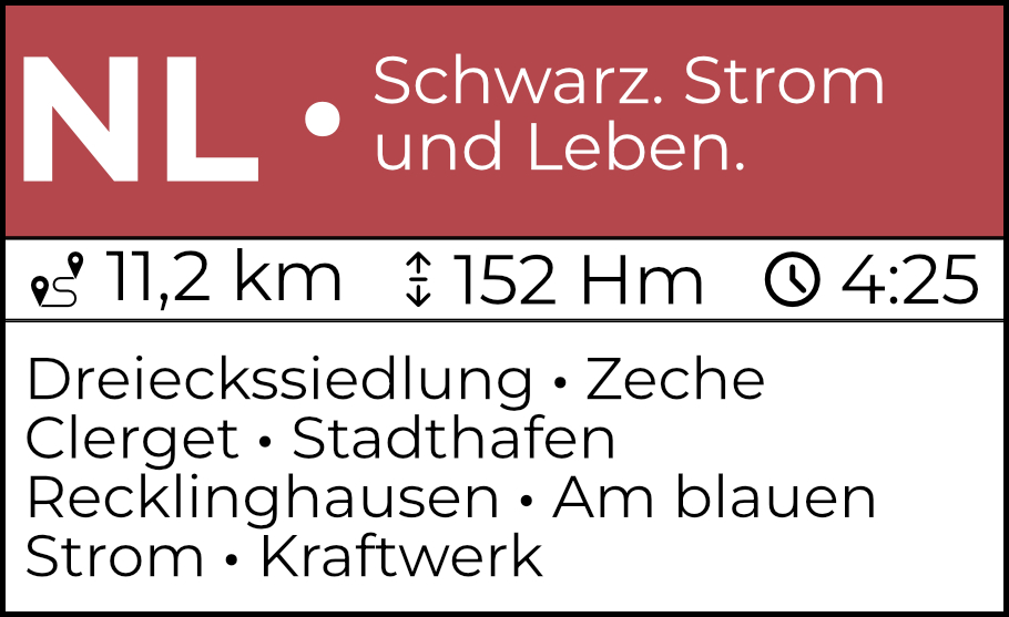 Im Zentrum der HHH-Region, dem Landschaftspark Hoheward, bilden die Halden Hoheward und Hoppenbruch die größte Haldenlandschaft in Europa und den höchsten künstlich geschaffenen Punkt der Region. Hier verlaufen vier N-Themenrouten, wobei N für Neues steht. Auch bei namensgleichen Erzählstationen unterscheiden sich deren Inhalte je nach Themenroute. Die Tour NL geht primär durch Recklinghausen. Sie fokussiert wie NE auf Energiegewinnung, konzentriert sich aber auf Kohlebergbau, Siedlungsentwicklung und Menschen. Erzählt wird über die Zechen Recklinghausen II und Klärchen sowie die alte Kolonie und Dreieckssiedlung der Bergleute. Dann geht es auch um Industrieansiedlung, Kanalhafen, Stromerzeugung und die damit verbundenen Neuerungen. Auf halber Wegstrecke lohnt dazu ein Besuch des Museums Strom und Leben (mit Café). Erst am Ende der Tour geht es hoch hinaus auf Halde Hoheward. Von oben ist die Rückschau auf das erwanderte Areal und weiter in den kontrastreichen Stadt-Landschaft-Raum möglich.