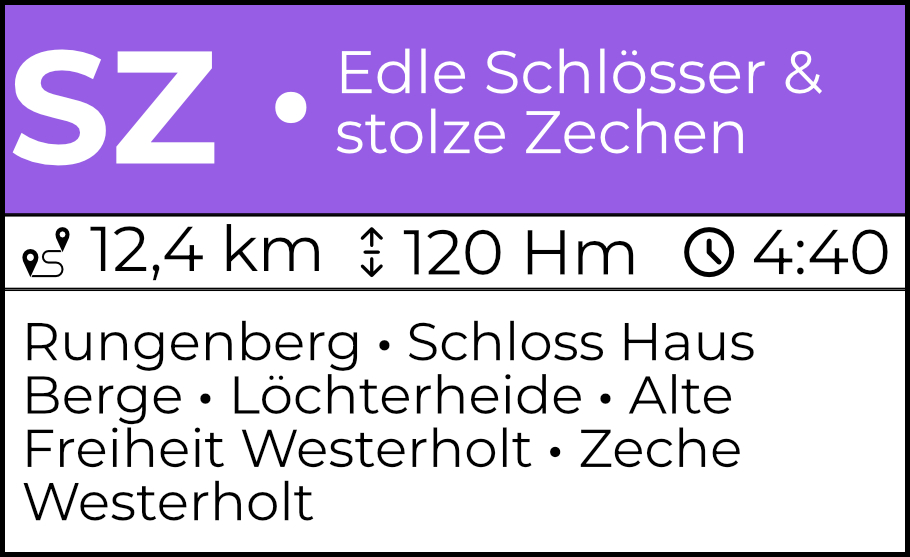 Die Thementour SZ befindet sich im Raum Gelsenkirchen-Herten und ist im Verlauf weitgehend identisch mit dem Vestischen Höhenweg. Anders als dieser ist sie aber eine echte Thementour mit Erzählstationen und muss für die richtige Abfolge von Westen kommend gewandert werden. Dann beginnt die Tour direkt mit dem Anstieg auf den höchsten Punkt, die Halde Rungenberg, und führt dann zu einigen historischen und herrschaftlichen Orten. Das sind die Schlösser Haus Berge und das des Grafen Westerholt, das Alte Dorf und etwas neuer die Kolonie und Zeche in Westerholt, wo die Tour dann endet. Die Tour führt dazwischen über weite Abschnitte durch grüne und offene Landschaft oder Wälder und Alleen. Ohne besondere Gefahren geht es so sogar durch den (ehemaligen) Löwenpark.